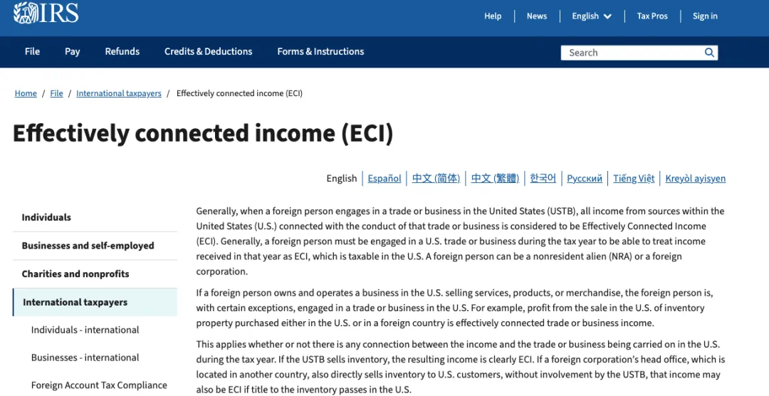 除了国内税务风险,卖家还需关注海外市场对税务合规的最新要求。根据美国国税局IRS发布的关于海外纳税人“Effectively Connected Income(ECI)”的指引,当外国人在美国(USTB)从事贸易或业务时,所有来自美国境内与该贸易或业务相关的收入均被视为有效关联收入(ECI)。