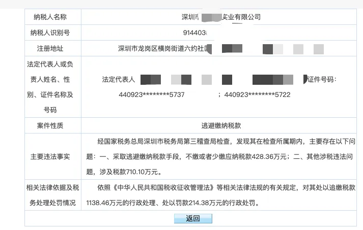 根据税务局披露,经国家税务总局深圳市税务局第三稽查局检查,发现其在检查所属期内,主要存在以下问题:一、采取逃避缴纳税款手段,不缴或者少缴应纳税款428.36万元;二、其他涉税违法问题,涉及税款710.10万元。