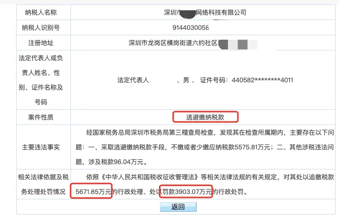 跨规盈在深圳市税务局查询发现,涉事公司是深圳市**网络科技有限公司,龙岗区的一家电商企业。案件性质是逃避缴纳税款。