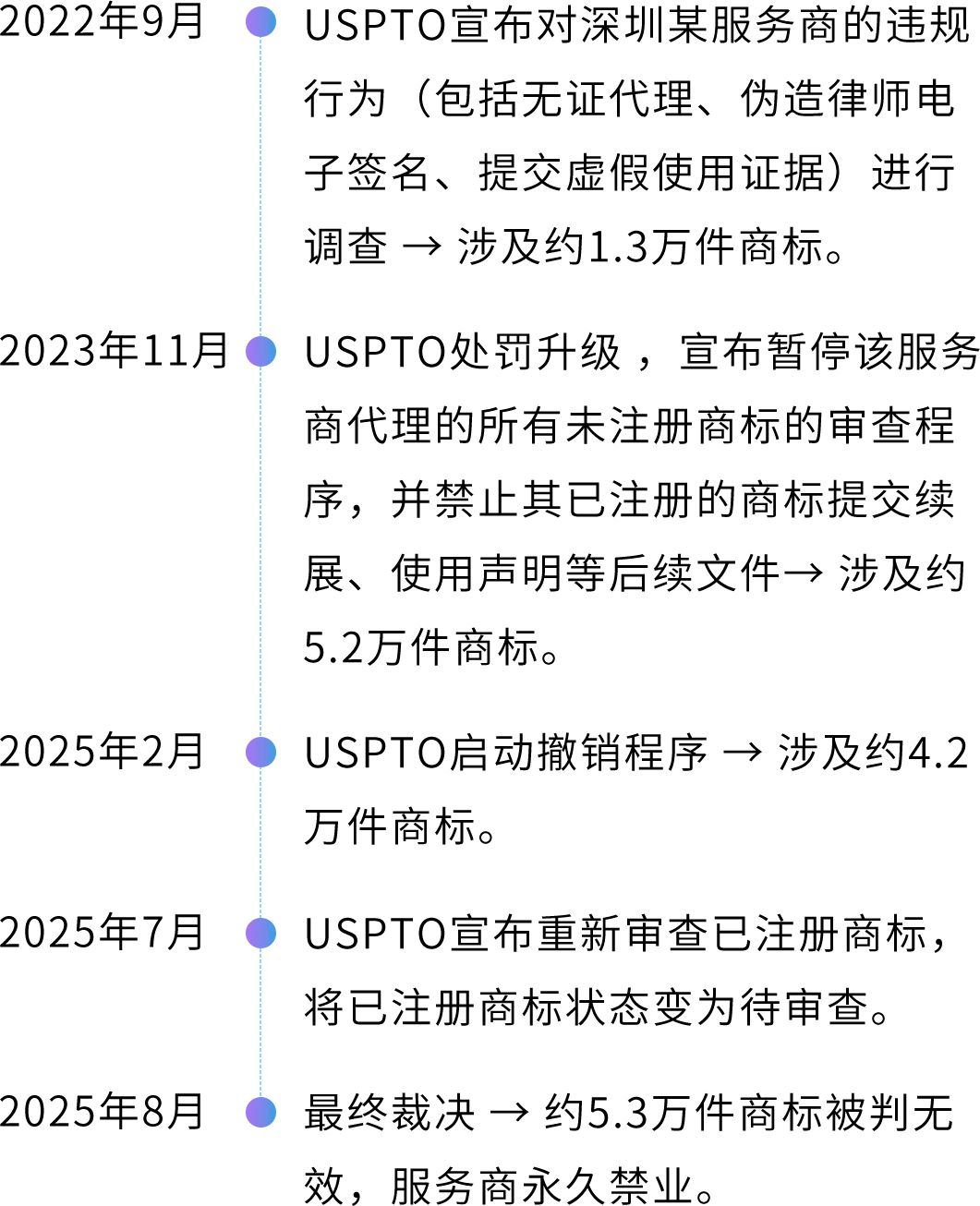 USPTO一直致力于打击商标申请时的欺诈行为,特别是外国代理机构的违规行为。从2022年起,USPTO针对深圳某服务商展开的系列调查及执法行动逐步升级,累计波及超过5万件商标申请。以下为该事件简表: