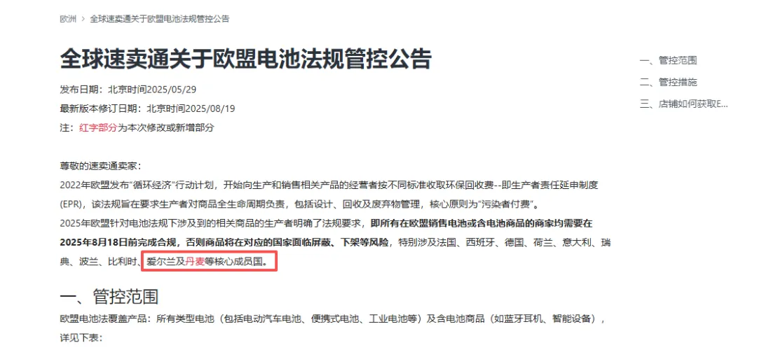 近日,速卖通平台更新了关于欧盟电池法规管控公告,新增了对丹麦国家的电池法管控。若卖家未及时完成合规,商品将在对应的国家面临屏蔽、下架等风险。