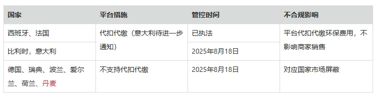 2、不支持平台代扣代缴的国家,包括德国、瑞典、波兰、荷兰、爱尔兰及丹麦,需要商家自主完成注册、申报等合规事项。