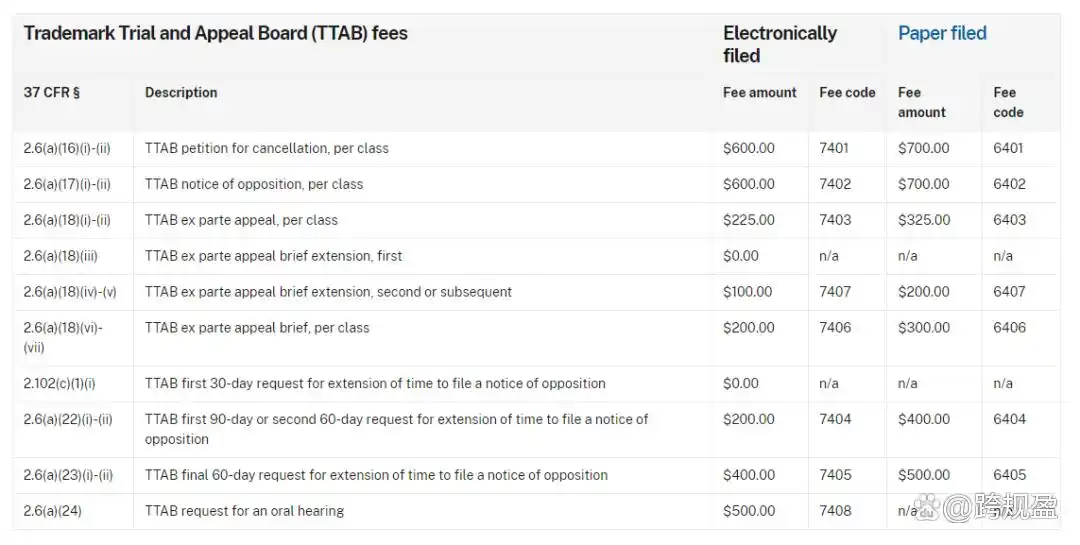 TTAB商标争议程序的官方费用