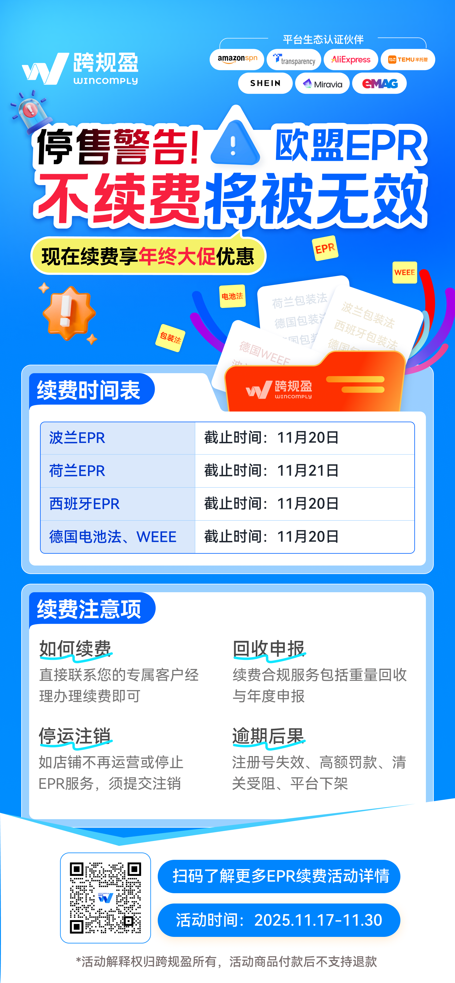 若未能按时完成EPR续费及合规要求,亚马逊等主流电商平台将对未合规商品执行强制下架操作,情节严重时还可能限制店铺销售权限。当前年终销售旺季已临近,为保障EPR注册号持续有效、确保店铺正常运营,建议卖家尽快推进续费事宜,规避潜在风险。
