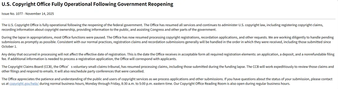 2025年11月14日,美国版权局(U.S. Copyright Office)官网发布公告:联邦政府重新开放后,美国版权局将结束持续45天的停摆,全面恢复运作,包括登记版权主张、记录有关版权所有权的信息、向公众提供信息以及协助国会和政府其他部门。