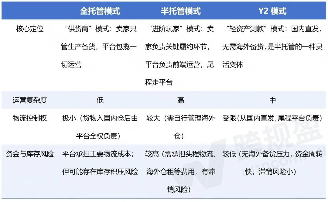 ③Y2模式:核心定位是“轻资产测款”模式,国内直发,无需海外备货,是半托管的一种灵活变体。卖家从国内直发,尾程平台负责,运营复杂度中等,资金与库存风险较低,无海外备货压力,资金周转快,滞销风险小。