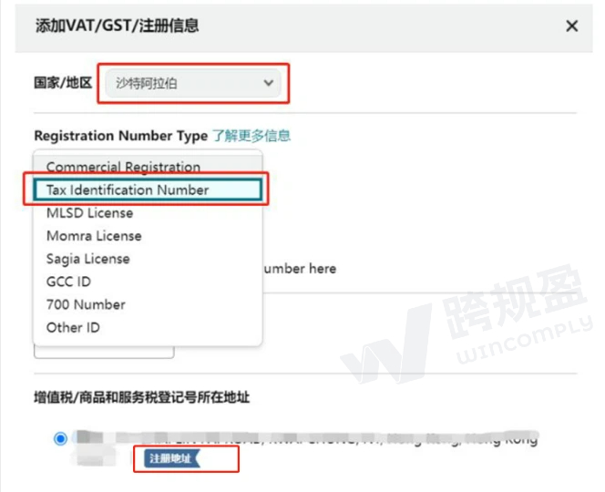 ④选择【增值税/商品和服务税登记号所在地址】:选择带蓝标的注册地址。当税号状态显示为绿色的【已验证】,表示增值税税号验证成功。