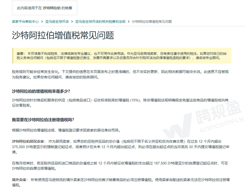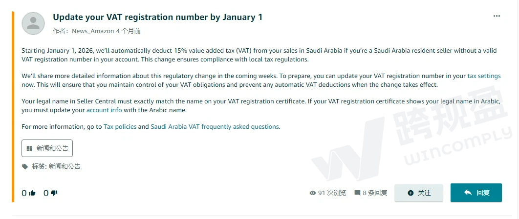 为此,亚马逊发出合规通知:自2026年1月1日起,如果您是沙特阿拉伯王国(KSA)的卖家,且账户中没有有效的增值税登记号(VRN),亚马逊将自动从您在沙特阿拉伯的销售额中扣除15%的增值税(VAT)。