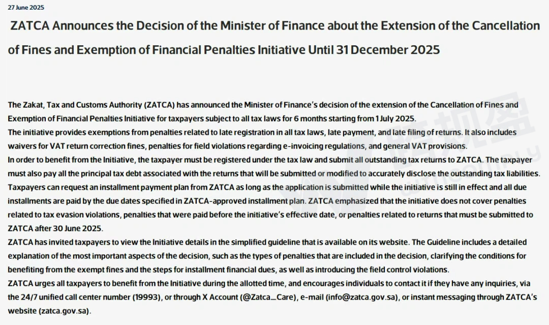沙特税务与海关总局(ZATCA)宣布将 “税务罚款豁免及减免计划”延长。这意味着,凡在2025年12月31日前完成税务合规(包括注册、申报、缴税)的卖家,可申请减免因晚注册、晚申报、晚缴纳产生的罚金。