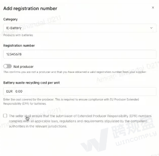 生产商还须提供电池成本信息,此部分费用由生产商自行承担。此字段会在您添加EPR电池注册号并表明自己生产商身份时显示。