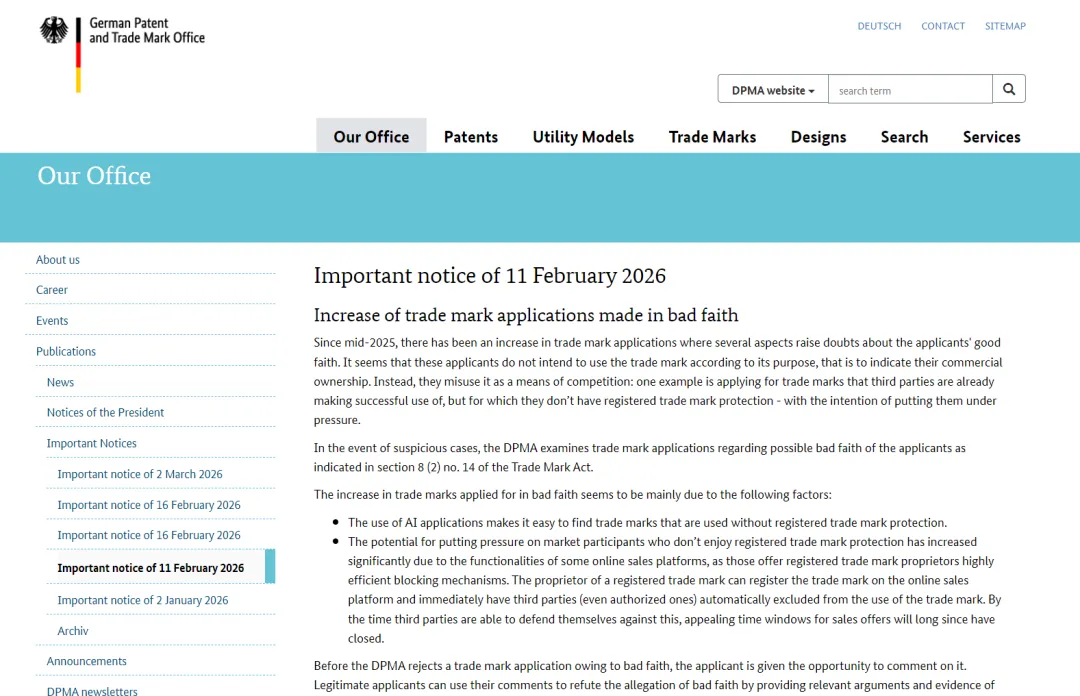 一直以来,德国以其高效的商标“准入制”吸引了全球申请人,但这也给了一些恶意抢注者可乘之机。近日,德国专利商标局(DPMA)发布公告,明确指出自2025年年中以来,德国商标恶意抢注申请量大幅激增,宣布将依据德国《商标法》采取更加严格的措施,全方位打击商标恶意抢注(Bad Faith Registration)及滥用商标制度的行为。