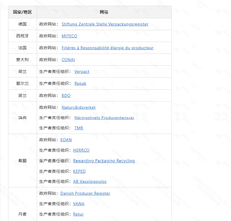 根据Temu公告解读,要求卖家关注以下或需要完成包装EPR注册的国家网站及生产者责任组织网站: