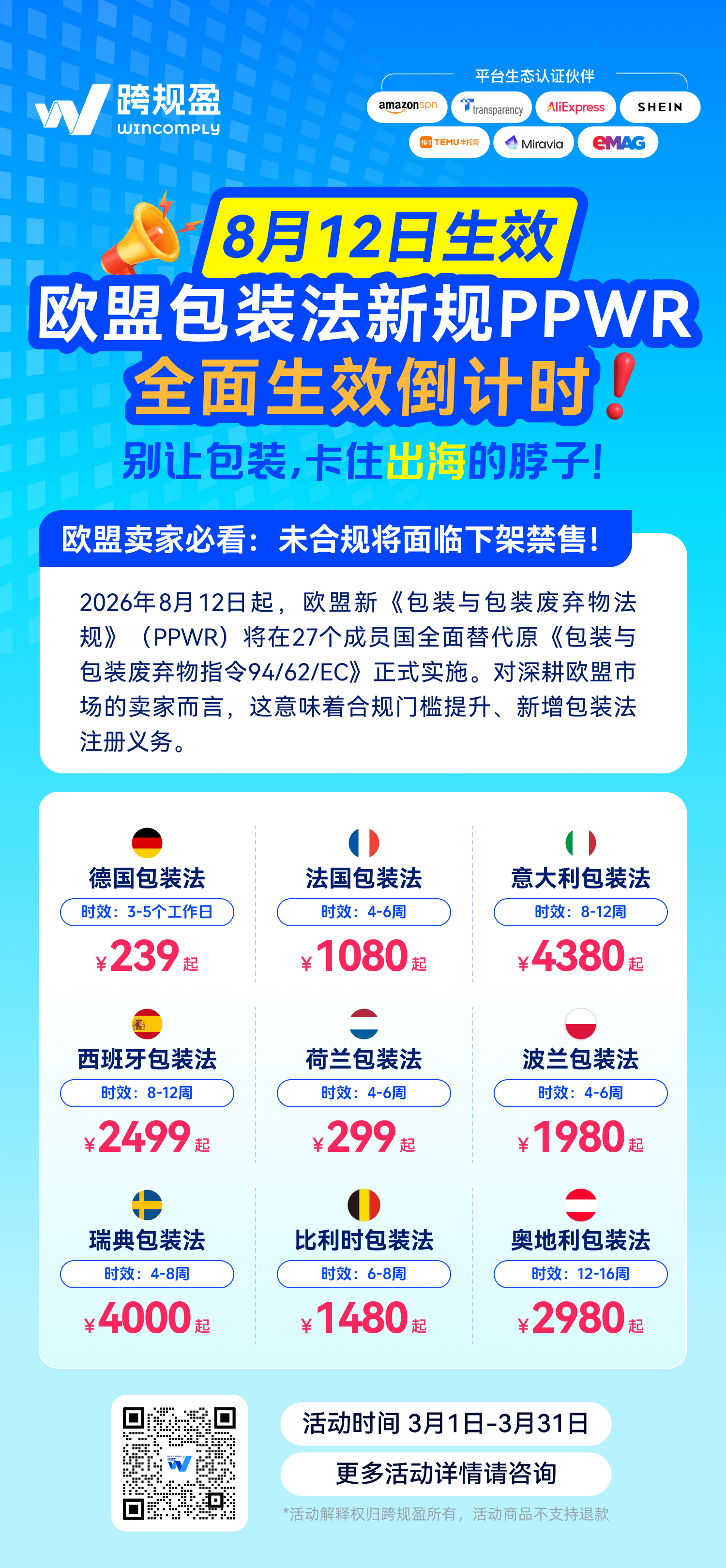 特别是对于参与亚马逊物流欧洲整合服务Pan-EU的卖家:如果未能在截止日期前完成德国、法国、意大利、西班牙、荷兰这五个国家的PPWR合规,受影响的产品不仅可能会被停售,同时将失去该产品在Pan-EU中的权益。