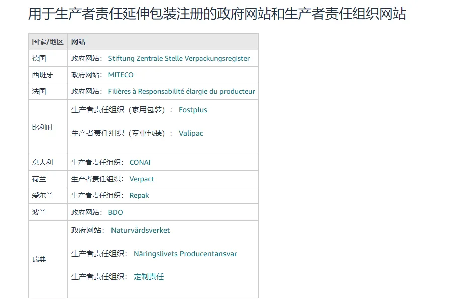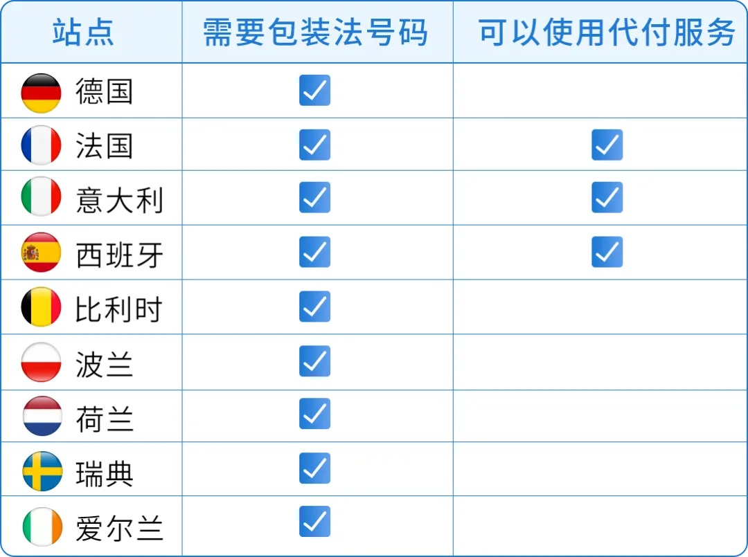 其中,德国、比利时、波兰、瑞典、荷兰、爱尔兰站点,亚马逊目前不提供包装法代付服务。因此,卖家必须自行完成包装法EPR号注册、申报和缴费。