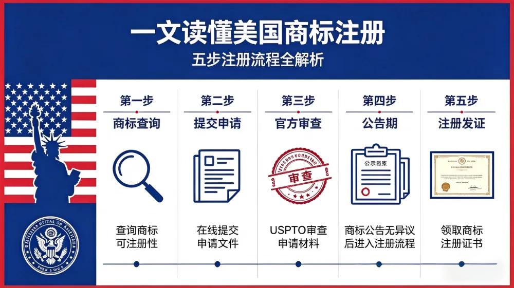 美国商标注册流程严谨,通常包含以下五个阶段: