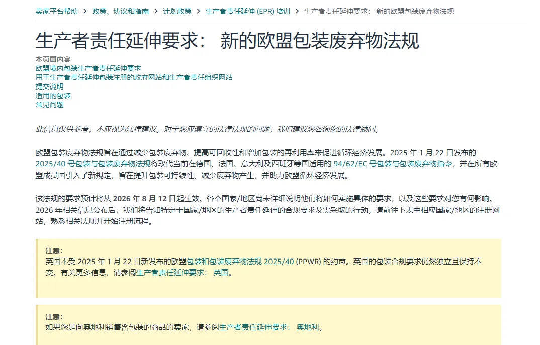2026年8月12日,欧盟新《包装与包装废弃物法规》(PPWR)将正式实施,全面取代旧指令。同时,亚马逊也发布了PPWR合规要求,提醒在欧盟国家进行销售的卖家提前准备包装法的注册。