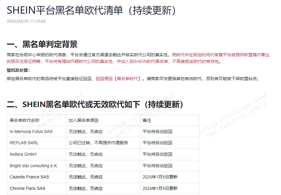 随着整个行业合规监管不断收紧,亚马逊、速卖通、Temu、SHEIN和阿里国际站等主流平台纷纷加大了对欧代资质的审核力度,SHEIN近期更是接连将一批违规欧代机构列入黑名单。