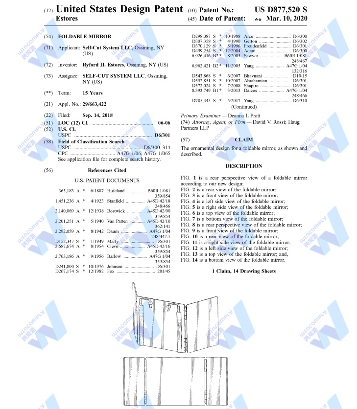 专利名称FOLDABLE MIRROR,专利号USD877520S,2018年9月14日申请,2020年3月10日下证: