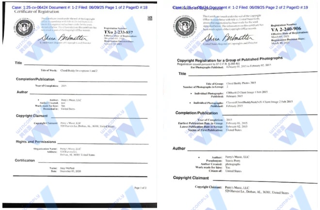 涉案版权号为TXu002233857 、VA0002240906,具体版权作品尚未公开,品牌方的图片、产品描述等都不建议使用。