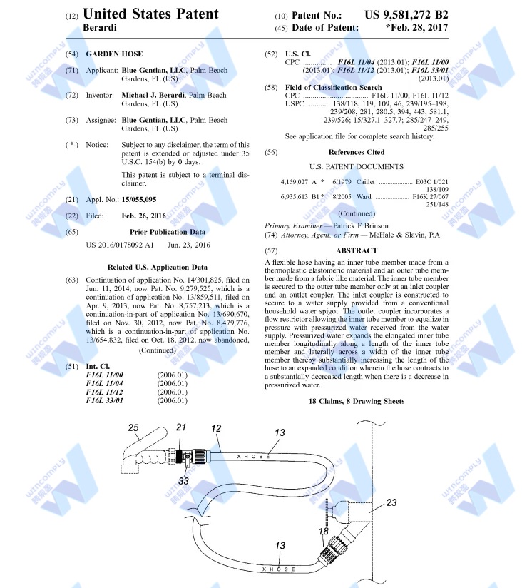 涉及名为Garden hose的美国发明专利,专利号US9581272B2,2016年2月26日申请,2017年2月28日下证: