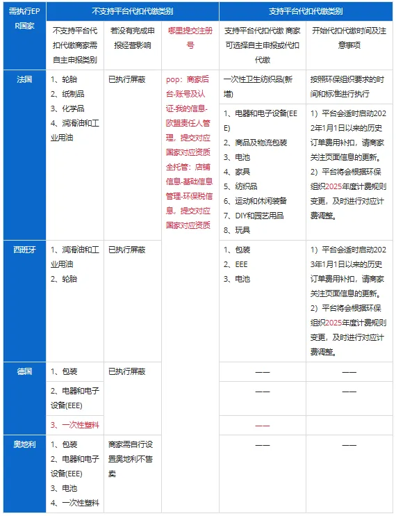 若您在法国、西班牙有相应的商品售卖且在2025年及过往的EPR的合规申报中使用了平台的代扣代缴服务,平台会按照对应国家不同类目EPR回收组织要求进行扣费标准的调整与更新。