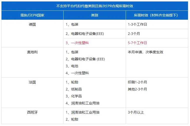 尽早完成EPR的注册及申报事宜,特别是不支持平台代扣代缴的类别,在材料齐全的前提下所需要的时效参考如下: