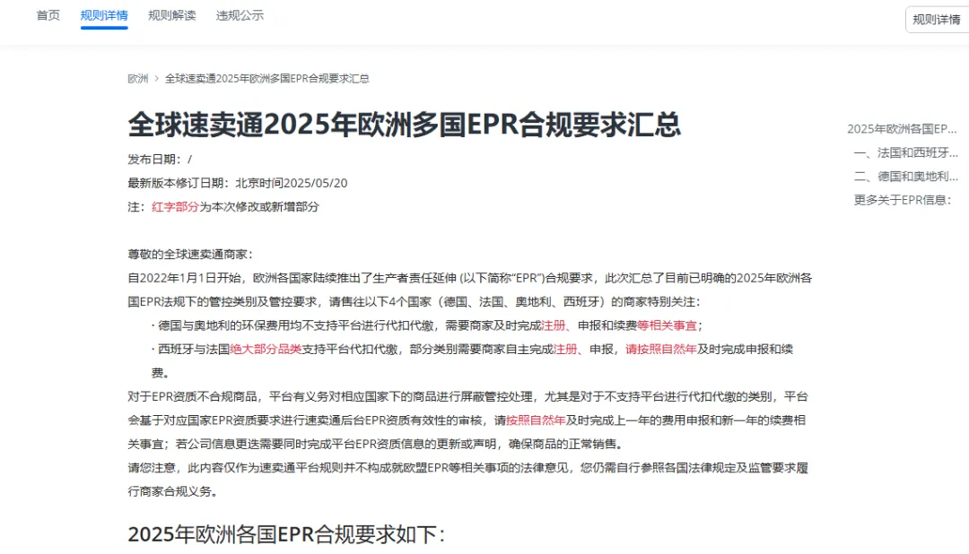 都2025了,您的EPR合规了吗?近日,全球速卖通发布了关于欧洲EPR的合规公告。本次公告汇总了目前已明确的2025年欧洲各国EPR法规下的管控类别及管控要求。