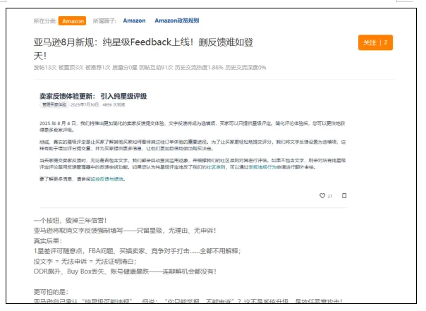 然而,新规落地后,对于那些仅包含星级、无任何文字内容的 1 星 Feedback,卖家将无法再通过常规申诉渠道申请删除。