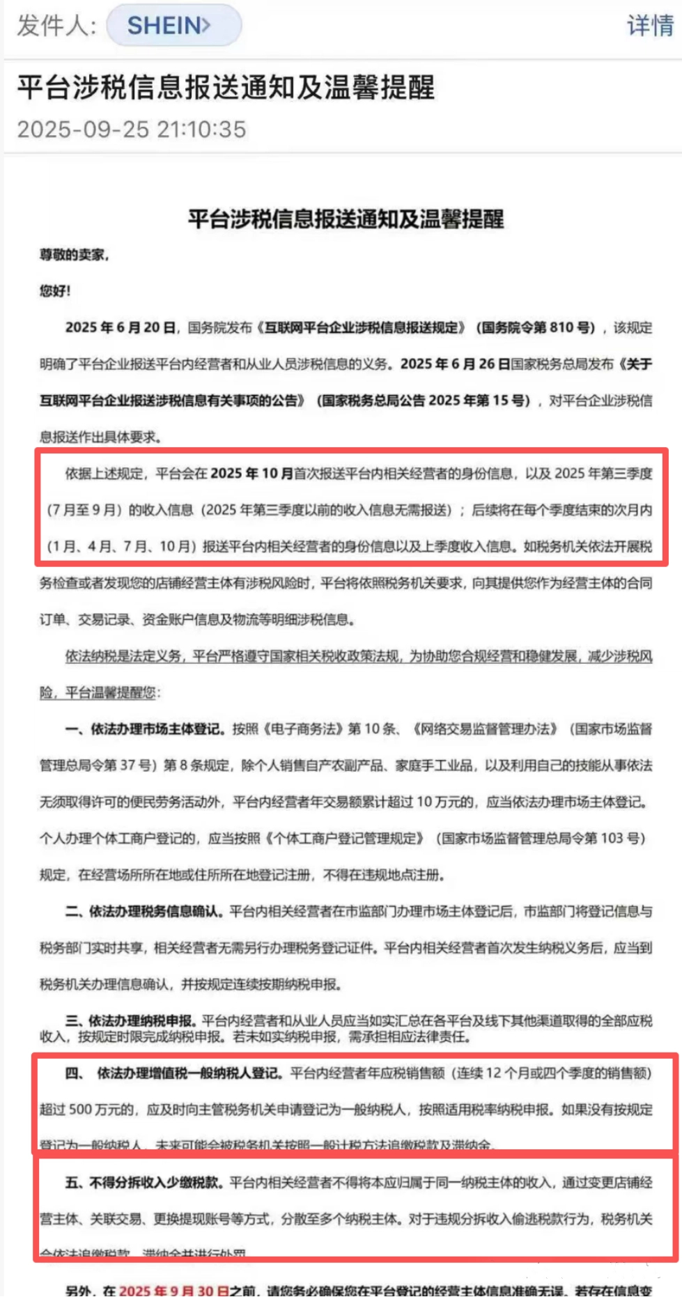 2、不得分拆收入,目前shein和速卖通公告中也以同步此项要求,可见这一项是推送的关键信息,也是税局比对的关键要素,要严格遵守;