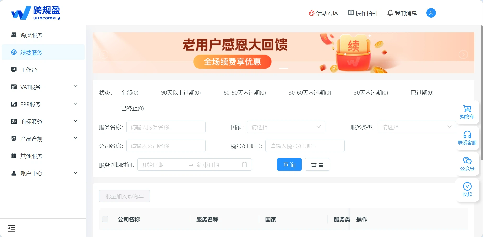 在跨规盈购买EPR合规服务,卖家可以登录跨规盈平台-【续费服务】完成续费。