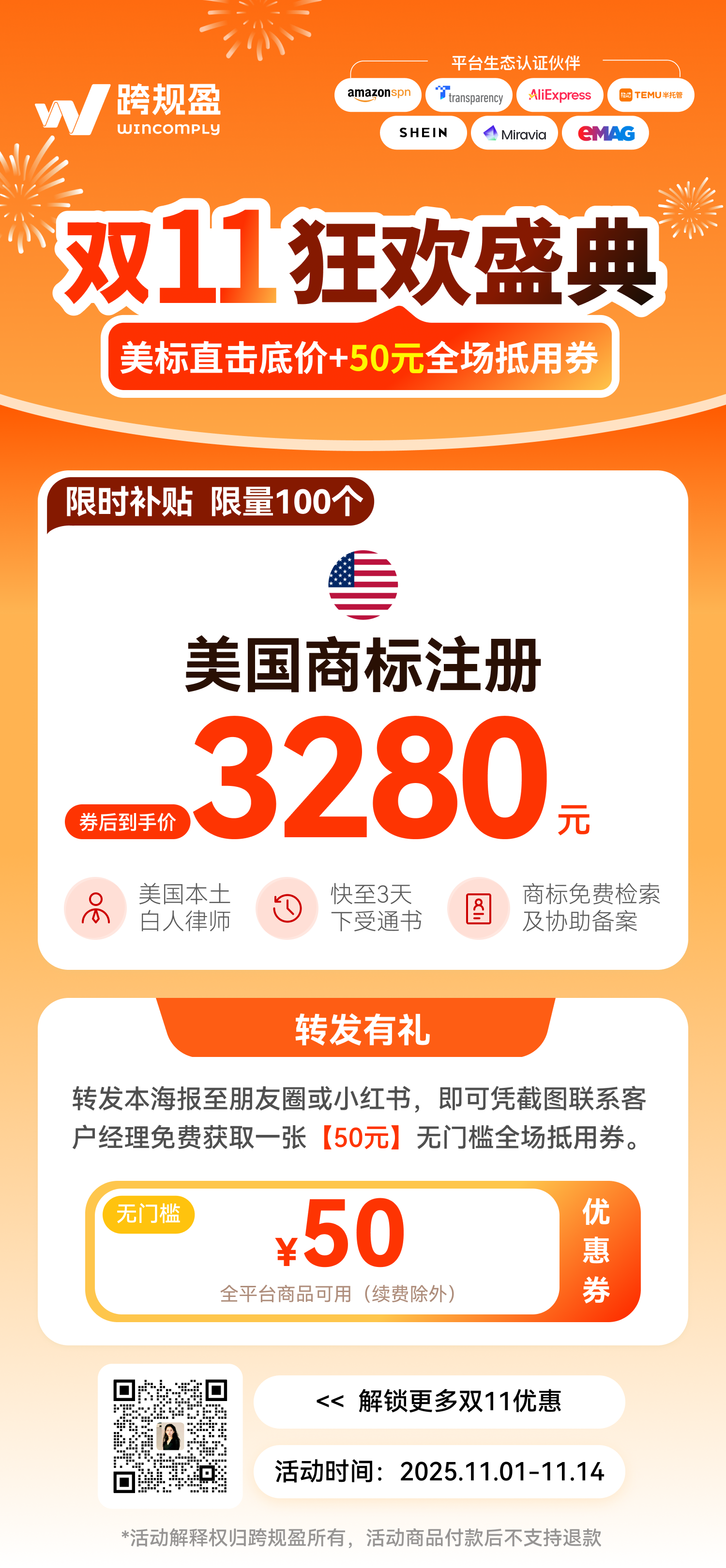 跨规盈双11商标限时补贴活动火爆进行中,现在下单美国商标有机会最低享3280元~更多活动详情可扫码联系小盈~