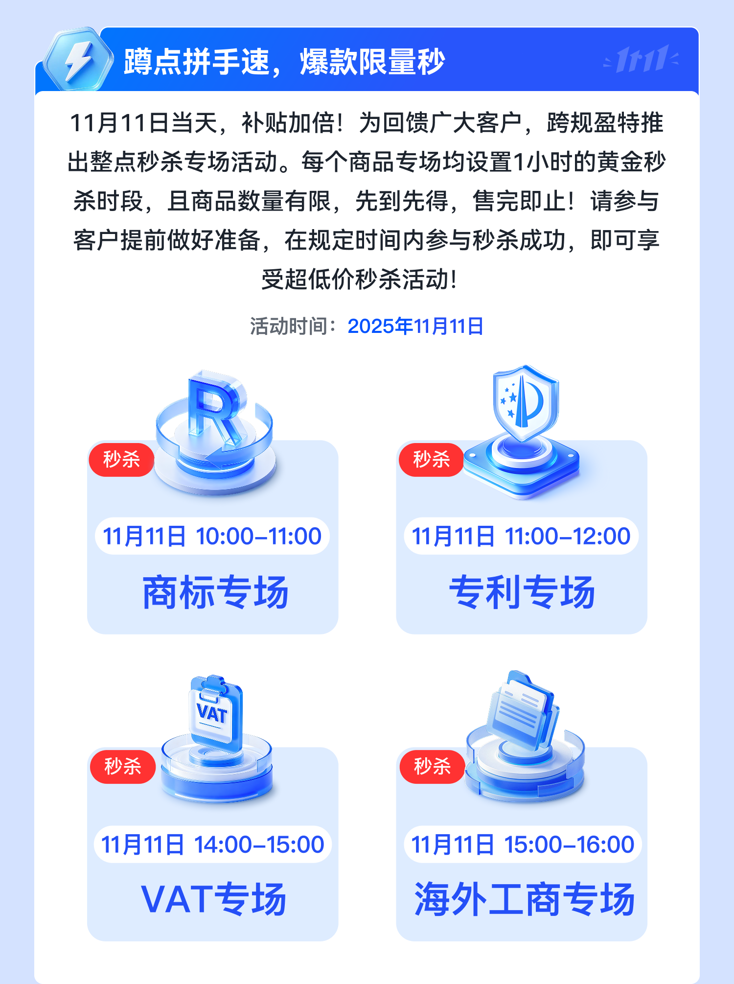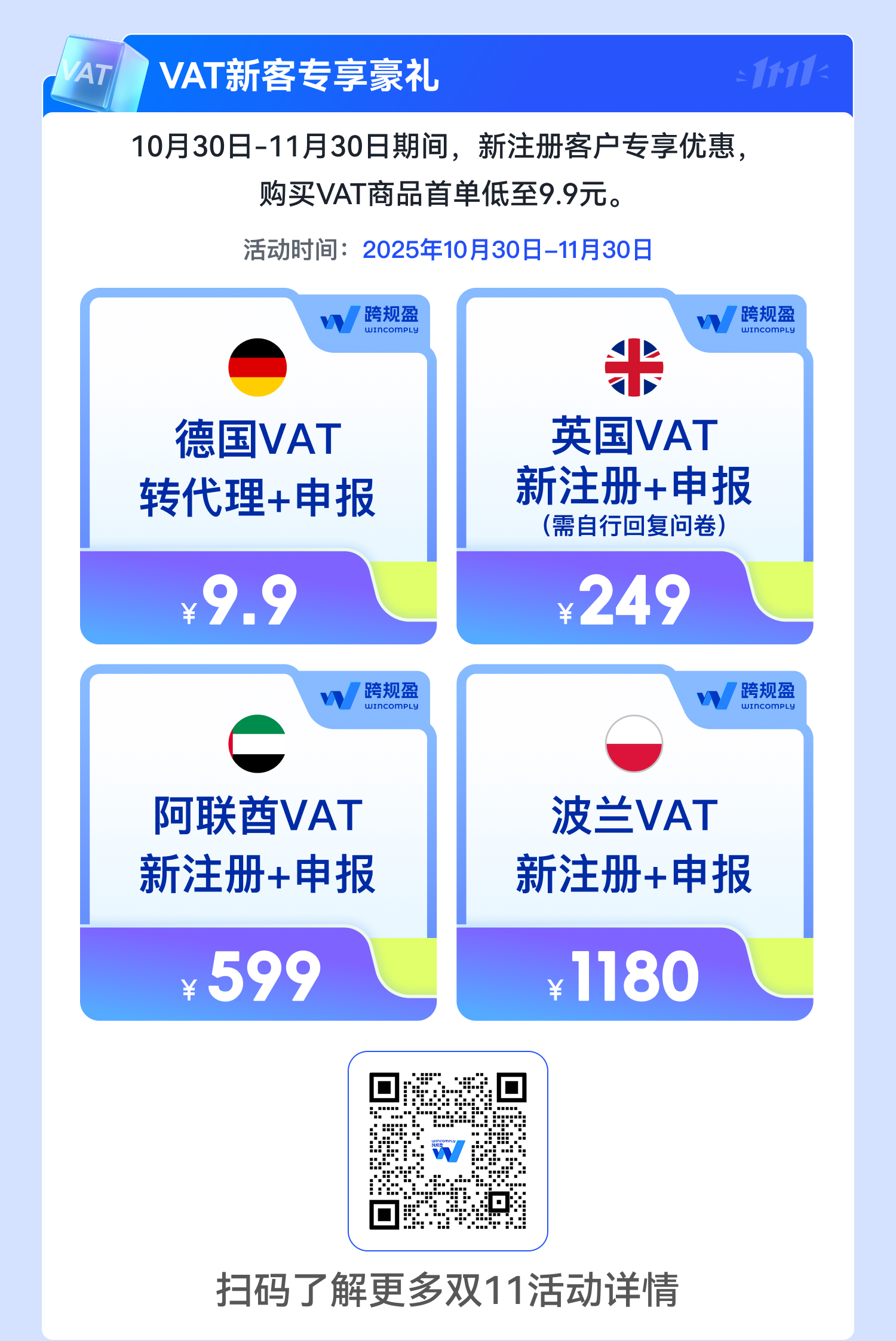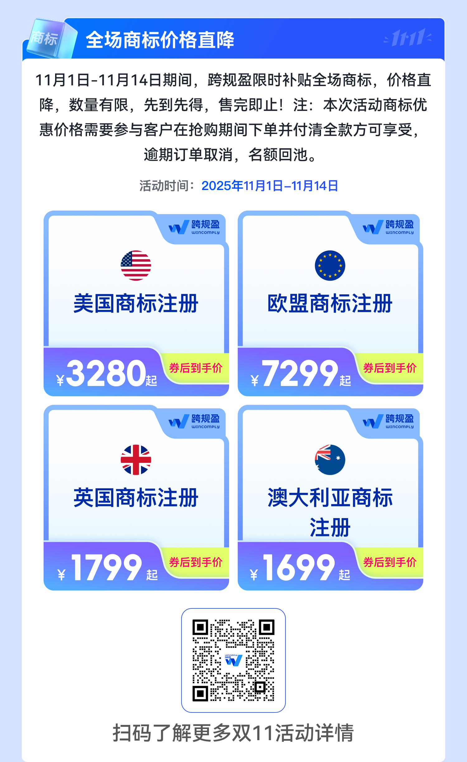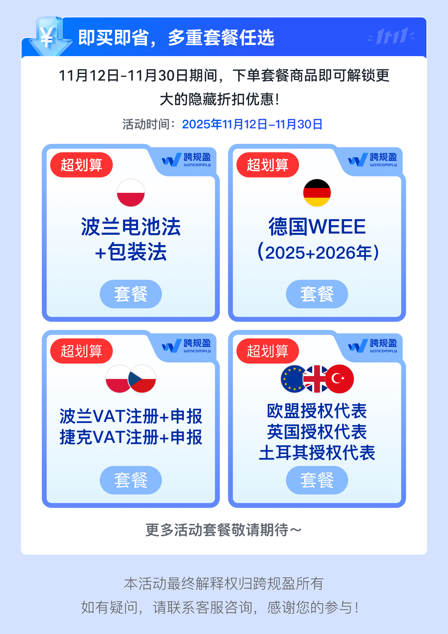那么,卖家该如何击破合规成本高昂的问题呢?跨规盈作为一家专注于为全球跨境卖家提供海外合规服务的专业机构,今年双11推出了VAT/EPR/商标专利/授权代表/海外工商超低价年终大促。