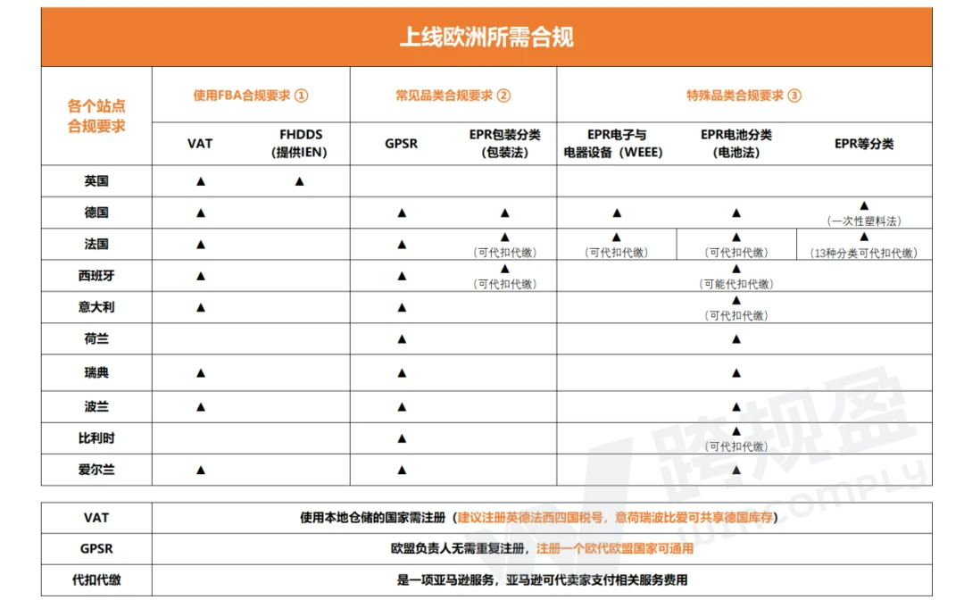 欧洲10大站点合规要求不一,卖家可对照以下表格快速自查: