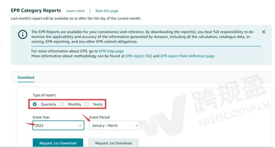 登录亚马逊卖家中心,进入“数据报告” > “亚马逊增值税交易报告”,在“创建报告”时选择“生产者责任延伸报告”即可下载。