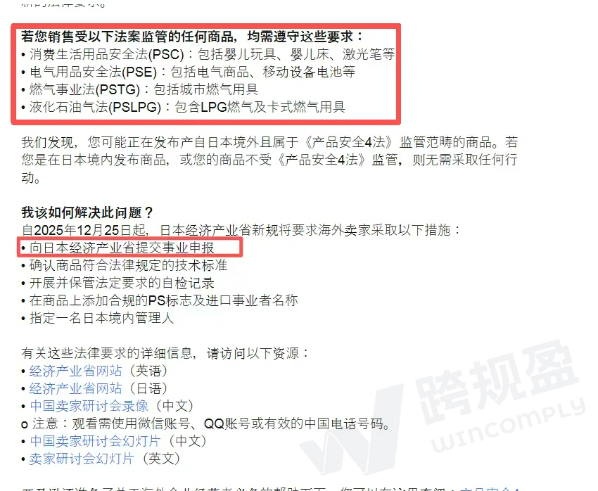 自2025年12月25日起,亚马逊已正式对未按要求完成日本经济产业省(METI)营业申报的卖家采取管控措施,部分商品因不合规被暂停销售。此次行动源于日本修订后的《四项产品安全法》——该法规明确要求,所有向日本市场销售受管制产品的海外经营者,必须以“特定进口经营者”身份完成申报,否则将失去销售资格。