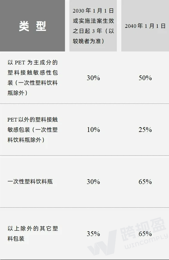 3、2029年1月1日或实施法案生效日期起24个月后的日期,以较晚者为准,包装中的再生材料比例需符合实施法案的规定。