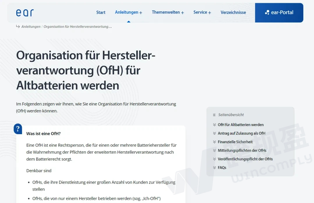 OfH(生产者责任组织)是德国环保局(ERA)的下属回收机构,也是EAR对电池回收合规性的首层审查机制,主要负责协调电池的延伸生产者责任(EPR),为制造商履行其收集和回收义务提供法律框架。