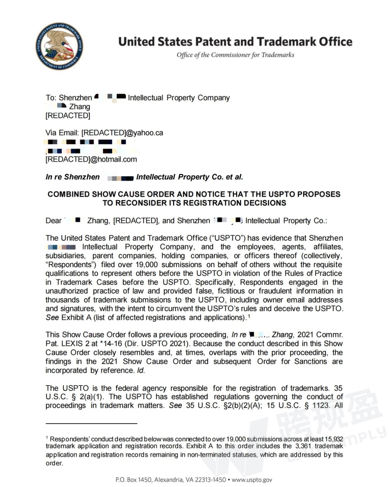 近日,USPTO针对深圳一家知识产权公司发布Show Cause Order(补充陈述理由令),指出其在2009-2021年期间涉嫌多项违规操作,包括: