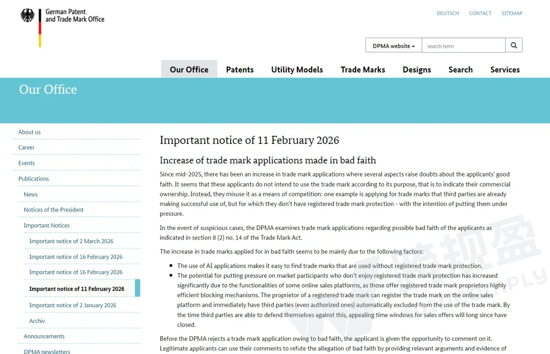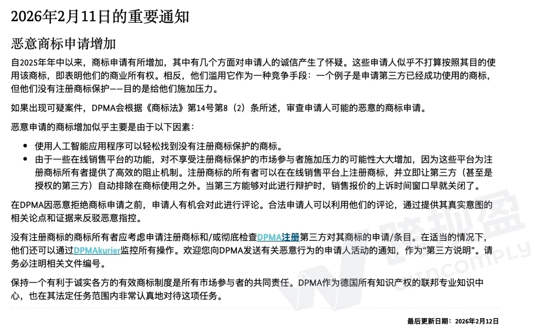 近日,德国专利商标局(DPMA)发布一则重要通告,明确表示自2025年年中以来,恶意抢注商标申请量大幅上升,官方将启动强化审查机制,从源头遏制这一趋势。
