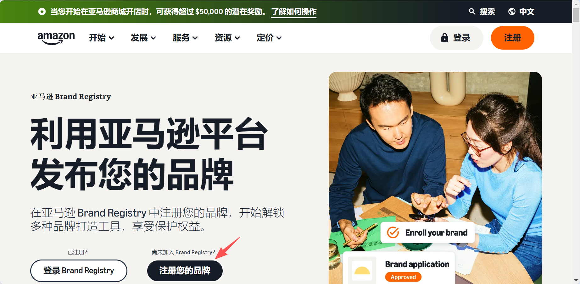 请进入亚马逊品牌注册官网(https://sell.amazon.com/brand-registry),点击“注册您的品牌”。