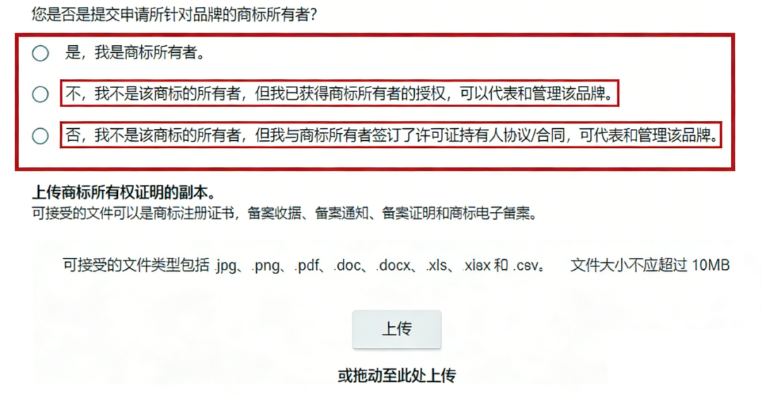(1)若为商标所有者,即备案店铺与商标持有人一致,则需上传商标所有权证明,例如商标注册证书或TM标受理回执。