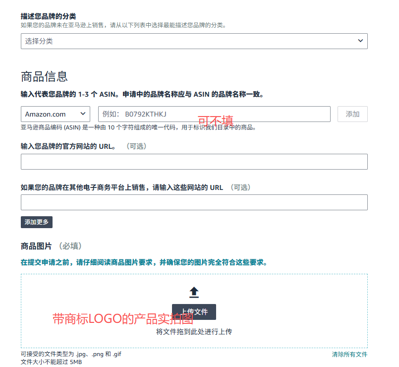 请在对应的信息框中填写品牌名称、品牌徽标、对应商标局、注册号或序列号等信息(以美国站为例)。
