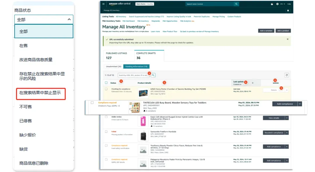 第二步:在左侧【在搜索结果中禁止显示】看到需要完成合规的Listing,找到有合规风险的Listing👇