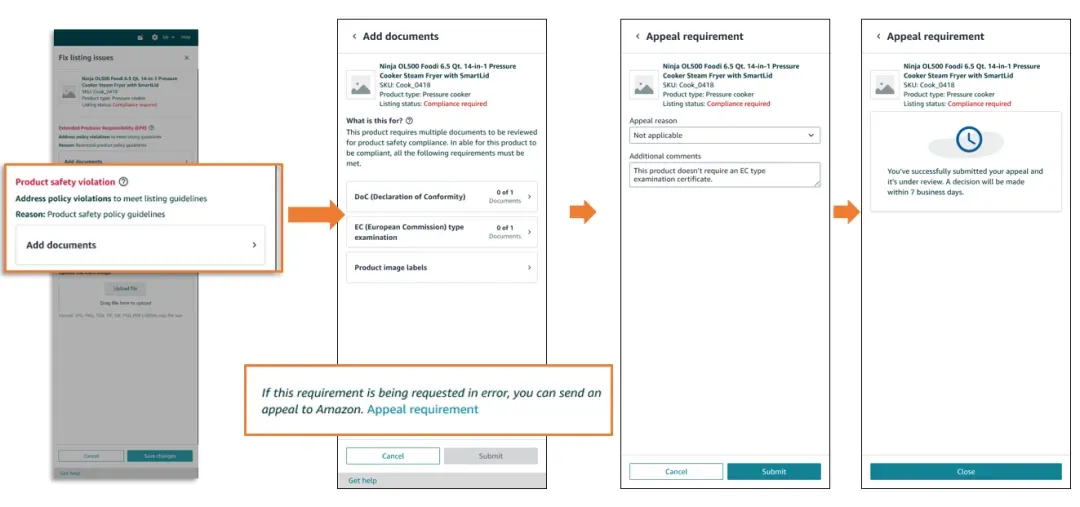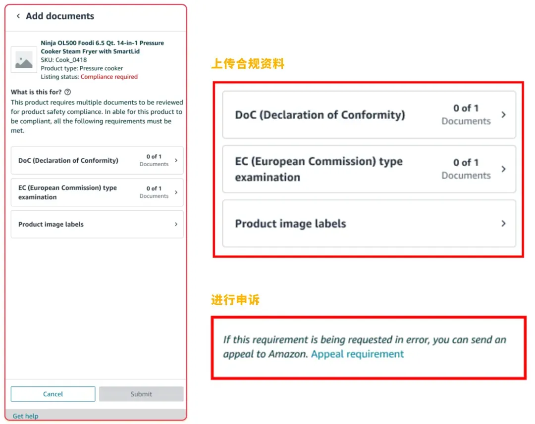 如未审核通过,则重新进入【管理所有库存】界面重新提交合规材料。若认为是亚马逊误判,可进入到对应的Listing进行申诉。